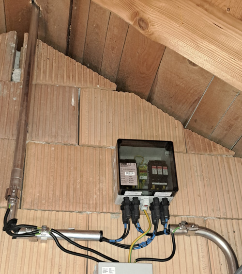 In Österreich müssen die DC-Kabel innerhalb eines Gebäudes laut OVE-RICHTLINIE R 11-1 im Mauerwerk oder in elektrisch leitfähigen Metallrohren oder Metallkanälen geführt werden, daher habe ich für die Verbindung 32 mm Alu-Rohre verwendet. Nachdem bei meinem Haus kein Blitzableiter vorhanden ist, kommt im GAK ein Typ 2 Überspannungsableiter zum Einsatz. Der Überspannungsableiter ist über ein 16 mm² Erdungskabel mit der Potenzialausgleichsschiene (PAS) im Keller verbunden. Zusätzlich zum Überspannungsableiter im Dachboden habe ich auch im Wechselrichter einen Überspannungsableiter verbaut, da das Kabel zwischen Wechselrichter und GAK länger als 10 Meter ist.