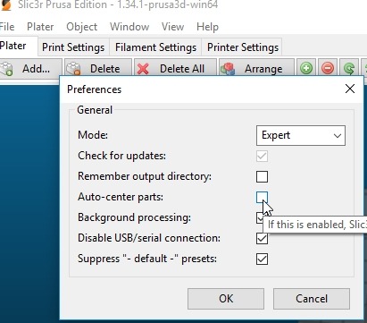 Damit in Slic3r die Objekte beliebig platziert werden können, muss die Option "Auto-center parts" deaktiviert werden: