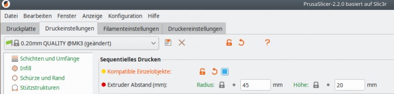 die Parameter "Extruder Abstand" und "Höhe" geben vor mit welchen Abstand es noch möglich ist die Objekte ohne Kollision des Druckkopfes zu drucken.