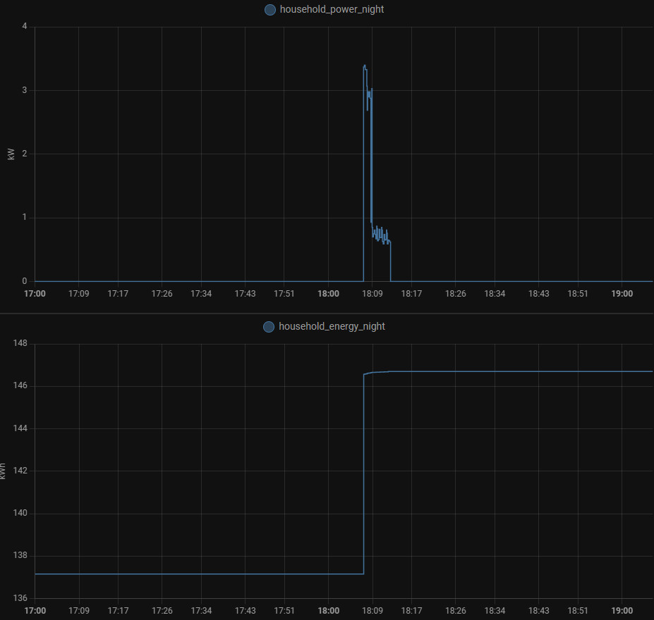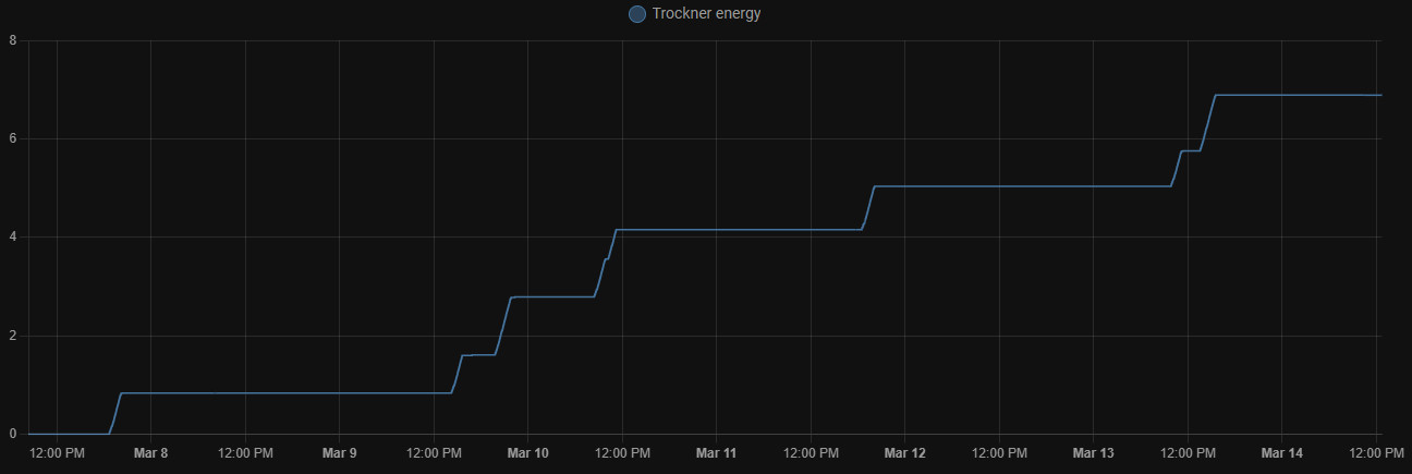 Zusätzlich ermöglicht die "Platform Integration" als „utility_meter“ die Zuordnung des summierten Verbrauchs zu spezifischen Zeitspannen. Diese können je nach Bedarf, stündlich oder täglich abgestuft werden, um eine detaillierte Verbrauchsübersicht zu erhalten. Wird als Methode für den Riemann Summenintegralsensor "Trapezregel" verwendet, kann ein Spike dazu führen, dass der Energiezähler zu viel zählt: