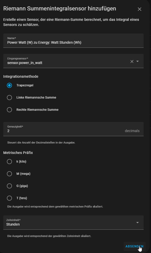 Ein nützliches Werkzeug, um aus Momentanwerten den kumulierten Verbrauch zu berechnen, ist der Riemann Summenintegralsensor. Dieser Sensor summiert Verbrauchswerte, wie Watt, um den Gesamtverbrauch in Wattstunden (Wh) zu ermitteln. Besonders bei der Auswahl der Methode des Summenintegralsensors ist Vorsicht geboten, da die Wahl zwischen der Trapezregel und der „left“-Methode zu unterschiedlichen Ergebnissen führen kann.