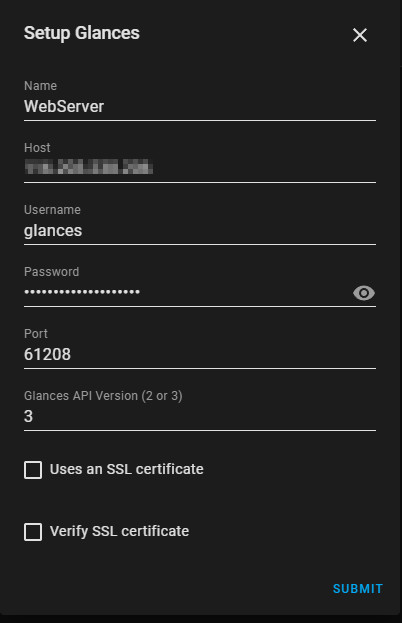 Wer den Status anderer Linux-Systeme überwachen will, kann dazu die Integration „Glances“ verwenden. Glances sammelt Daten zu CPU, Memory oder dem freien Speicherplatz einer Festplatte u.v.m.. Als Voraussetzung muss Glances zuvor auf den zu überwachenden Systemen installiert werden, siehe auch: Glances - Linux-Server überwachen