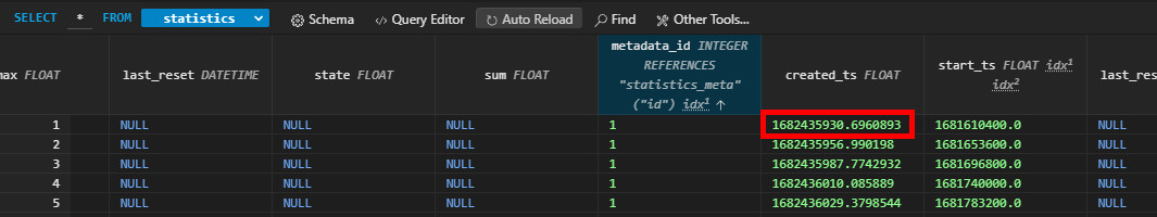 Nachdem die Daten der Tabelle "statistics_short_term" alle 5 Minuten in die Datenbank geschrieben werden, sollten spätestens nach dieser Zeit Daten des Sensors in der "statistics_short_term" Tabelle erscheinen. Für zusätzliche Informationen zum Zugriff auf die Datenbank, siehe: Home Assistant SQlite - Statistik-Daten ändern