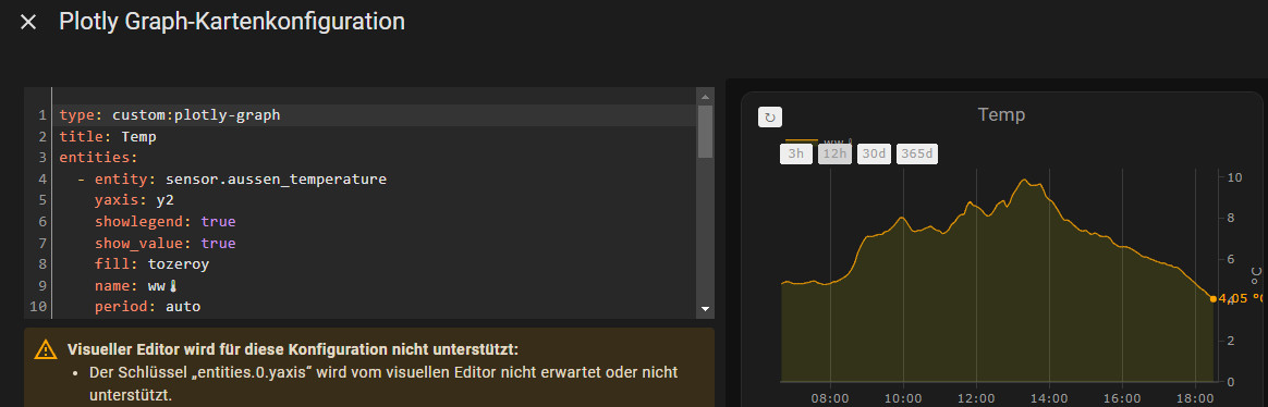 Für die Einstellung muss Ploty Graph im YAML-Editor angepasst werden. Hier ein Beispiel für die Visualisierung eines Temperatursensors: