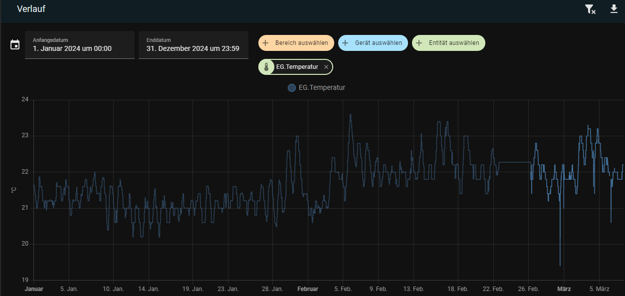 Das Verhalten von Home-Assistant beim Speichern der Sensor-Daten ist mehr oder weniger ein Kompromiss aus den gespeicherten Details und dem Alter der Daten: Für die letzten 10 Tage sind sämtliche Statusänderungen verfügbar, darüber hinaus kann nur mehr im Stundenintervall auf die Statistik-Tabelle zugegriffen werden. Funktionell hat sich in Home-Assistant hier in der Vergangenheit einiges getan, dennoch kann Home Assistant beim Speichern von historischen Daten nicht mit einer Timeseries - Datenbank wie InfluxDB und beim Visualisieren mit einer Lösung wie Grafana mithalten. Wer damit leben kann, dass Daten älter als 10 Tage nur mehr stündlich verfügbar sind, findet mit Plotly Graph dennoch eine würdige Alternative.