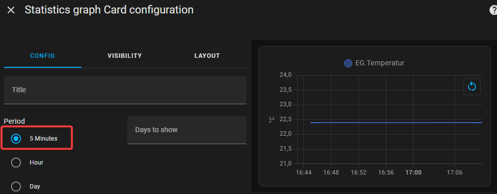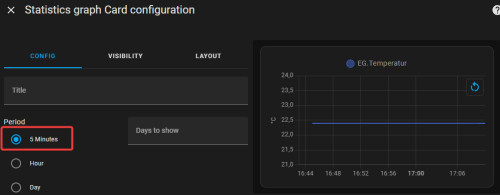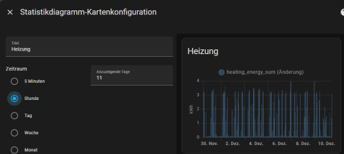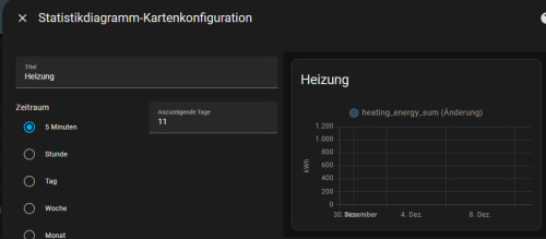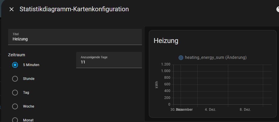 Die interne Datenbankstruktur von Home-Assistant kann auch anhand des folgenden Beispiels vermutet werden: Versuche ich in der Statistik-Karte als Zeitraum 5 Minuten einzustellen, kann diese nur bis zu 10 Tage anzeigen. Würde ich einen 11ten Tag auswählen, zeigt die Karte nichts mehr an: