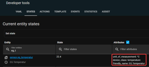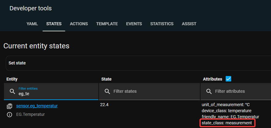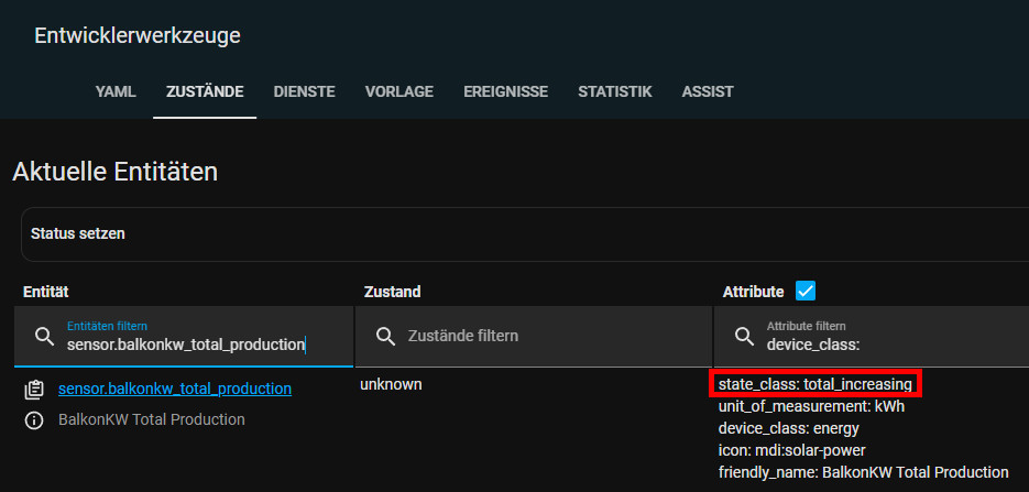 Nach dem Hinzufügen der fehlenden Eigenschaft und einem Neustart von Home-Assistant werden die Attribute um "state_class" ergänzt:
