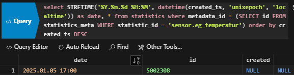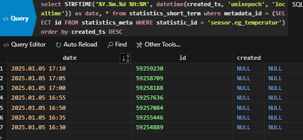 select STRFTIME('%Y.%m.%d %H:%M', datetime(created_ts, 'unixepoch', 'localtime')) as date, * from statistics where metadata_id = (SELECT id FROM statistics_meta WHERE statistic_id = 'sensor.eg_temperatur') order by created_ts DESC;