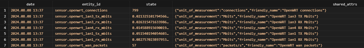 ZusĂ€tzlich zum aktuellen Status (state) besitzen bestimmte EntitĂ€ten zusĂ€tzliche Eigenschaften, abgelegt in einer zusĂ€tzlichen Spalte: shared_attrs. FĂŒr das Auslesen einer EntitĂ€t und deren zusĂ€tzlichen Eigenschaften (shated_attrs) kann die folgende Query verwendet werden: