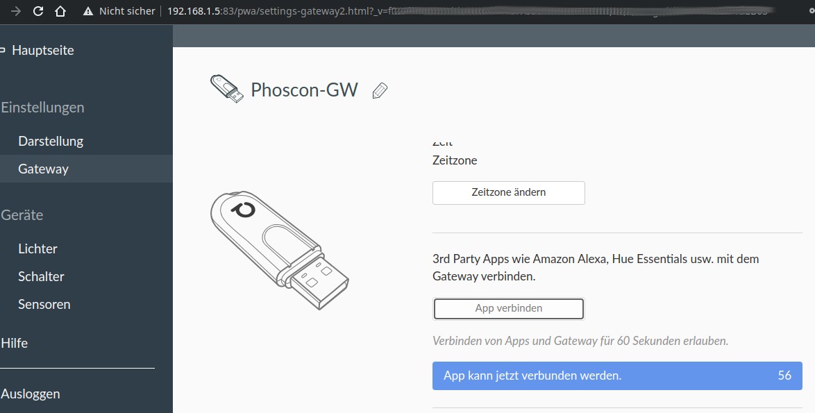 Wer ConBee und Phoscon bereits im Einsatz hat, muss als Vorbereitung für die Verbindung von Home Assistant das Phoscon-GW auf „App verbinden“ stellen: