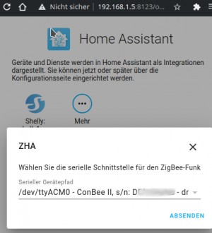 habe das gleiche Problem auf einem Raspberry Pie.. Zigbee als Integration gewählt 1.) wähle einen seriellen Port (serieller Gerätepfad) -> /dev/ttyACMO - Conbee II, s/n: DE??? 2.) Funktyp -> deCONZ 3.) Einstellungen der seriellen Schnittstelle (serieller Gerätepfad) -> /dev/ttyACMO (ist vorausgewählt, klappt aber nicht) auch wenn man den Pfad aus 1) dort einfügt geht es nicht ... was machen wir falsch :) (deCONZ als Addon konnte ich registrieren und auch in Phoscon schon Sensoren gefunden)
