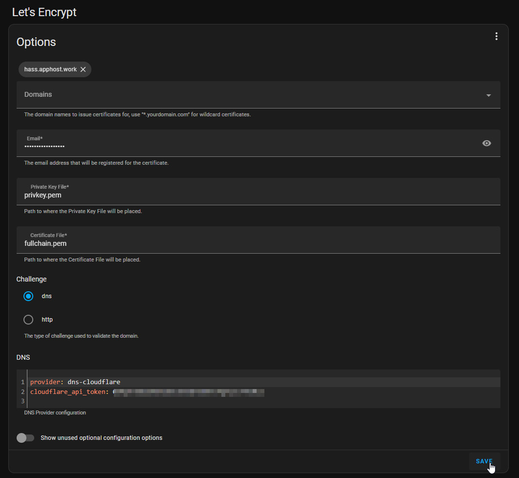 In den Options benötigt das AddOn jetzt noch die Information über den verwendeten DNS-Record (A-Eintrag) und die Email-Adresse für ev. Warnungen oder Information zum Zertifikat: