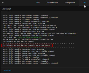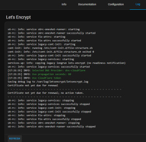 Nach dem Start des Add-Ons kümmert sich dieses um das Ausstellen und Verlängern des Zertifikats. Ein Blick in das Log zeigt, an dieser Stelle, dass bereits ein Zertifikat ausgestellt wurde und keine weitere Aktion notwendig ist: