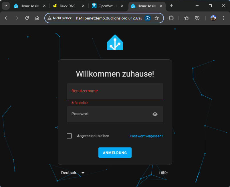 Ziel erreicht: Home-Assistant kann jetzt über https://???.duckdns.org:8123 mit einer verschlüsselten Verbindung vom Internet erreicht werden: