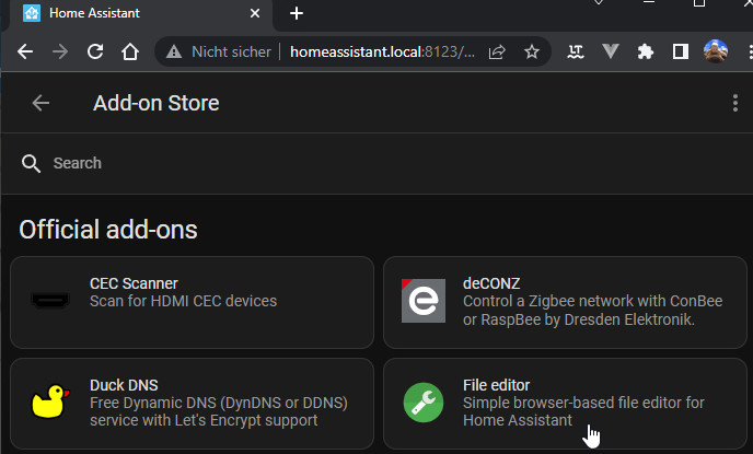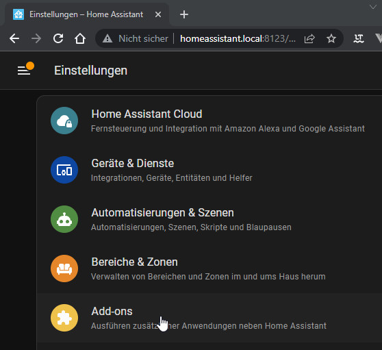 Im Gegensatz zu einer Docker-Installation, ist bei einer HAOS-VM der Add-ons-Store verfügbar: