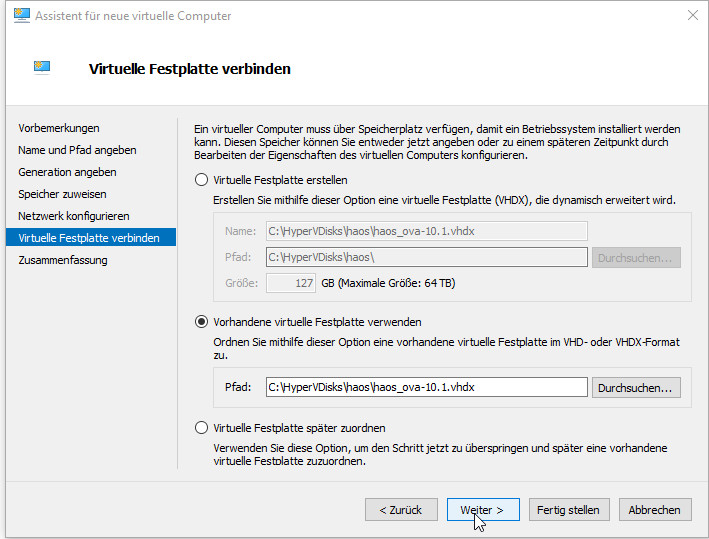 Als Disk kann die zuvor heruntergeladene HAOS Festplattendatei eingebunden werden.