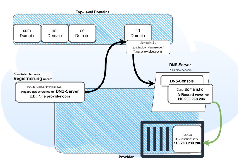 Damit die Domain funktioniert, muss der bei der Registrierung angegebene DNS-Server die DNS-Zone für die Domain bereitstellen, dazu reicht ein beliebiger DNS-Server mit einer öffentlichen IP-Adresse. Theoretisch könnte ein DNS-Service auch relativ einfach selbst betrieben werden, einfacher ist die Verwendung des DNS-Servers vom Provider über welchen die Domain registriert wurde. Der Provider stellt für deren registrierte Domains meist eine DNS-Verwaltung zur Verfügung. Über die DNS-Verwaltung können A-Einträge für die Haupt-Domain und Subdomains hinzugefügt werden, diese zeigen dann auf eine bestimmte IP-Adresse: