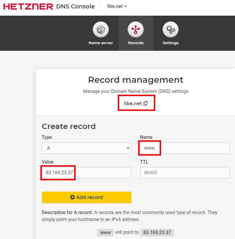 Für den Betrieb der Seite www.libe.net wird ein virtueller Server eines Hosting-Providers verwendet, ursprünglich von Host Europe, aktuell von Hetzner, siehe: Providerwechsel HostEurope vs Hetzner, vServer vs Cloud-Server. Der virtuelle Server, auch Cloud-Server genannt, besitzt eine öffentliche IP-Adresse, welche über die Domäne www.libe.net aufgerufen werden kann. Damit die Domäne www.libe.net die öffentliche IP-Adresse des virtuellen Servers verwendet, wurde die Domäne libe.net mit den DNS-Servern des Hosting-Providers registriert und in der DNS-Verwaltung des Providers in der Domänen-Zone libe.net ein entsprechender A-Record angelegt: www -> 83.169.23.37