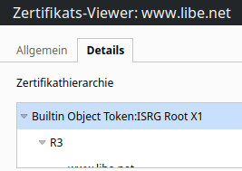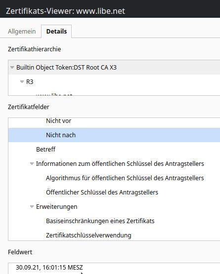 Ursprünglich hat Let’s Encrypt für einen schnelleren Start ein bestehendes Root-Zertifikat verwendet, welches in allen Geräten verfügbar ist: DST Root CA X3. Das Zertifikat hat als Ablaufdatum den 30.9.2021. Das Datum kann in den Details aller verwendeten Zertifikate begutachtet werden: