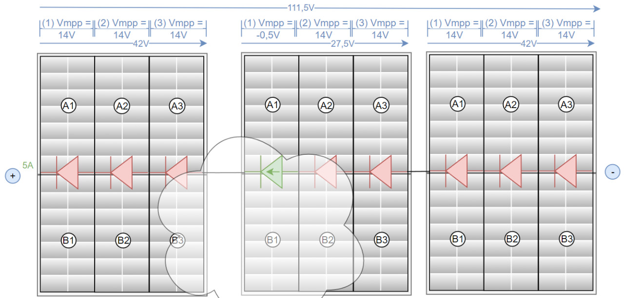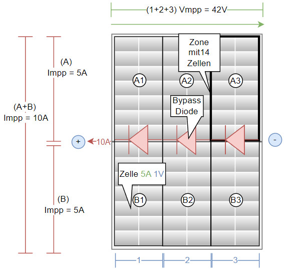 Zur Erklärung: Die Felder innerhalb der PV Module sind in 6 Zonen eingeteilt, hier A1-3 und B1-3. Die Zonen A und B sind parallel, die eigentlichen PV Zellen sind innerhalb der Zone und zudem die Zonen 1–3 in Serie geschaltet. Bei idealen Verhältnissen summieren sich die Spannungen der in Serie geschalteten Zellen bei gleichbleibendem Strom. Heutige PV-Module bestehen im Prinzip aus zwei einzelnen Modulen (im Bild A und B), welche Parallel geschaltet sind. Bei einer Parallelschaltung verdoppelt sich der Strom: Hier 5 + 5A = 10A. Das hier dargestellte PV-Modul liefert also 10A (I) und 42V (U), dies würde einer Leistung von 420Watt entsprechen (P=U*I).