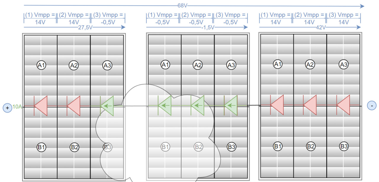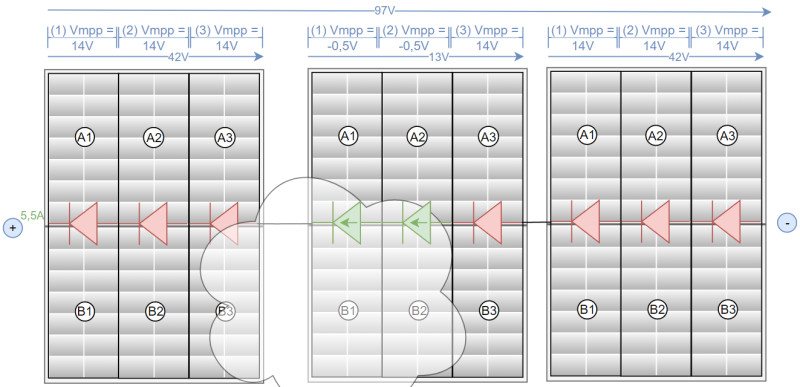 Die Bypass-Dioden helfen dabei auch, dass die beschatteten Zellen überbrückt werden, bevor diese überhitzen und dabei Schaden nehmen. Nachdem die Bypass-Dioden erst aktiv werden, wenn genügend Strom fließt, ist es wichtig, dass der Wechselrichter seine MPP-Spannung entsprechend herunterregelt. Nachdem ein PV-Modul sich intern wie 3 in Serie geschalteter Module verhält, erweitern mehrere Module in einem String die Schaltung um weitere Zonen, das Prinzip ähnelt aber dem eines einzelnen Moduls und dessen Zonen: