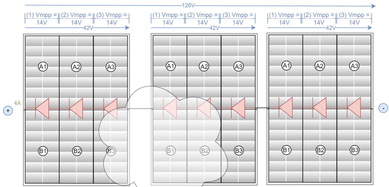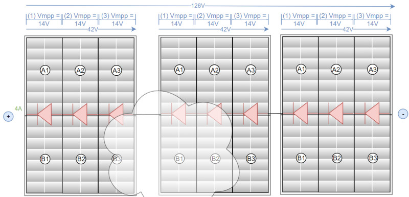 Wären die PV-Module nicht verschattet, würde eine Spannung von 42V*3Module = 126V Vmpp entsprechen. Angenommen die Verschattung in Modul 2 führt dazu, dass der Strom insgesamt von 10A auf 4A limitiert wird, würden die 3 Module eine Leistung von 126V*4= 504Watt bereitstellen.