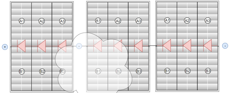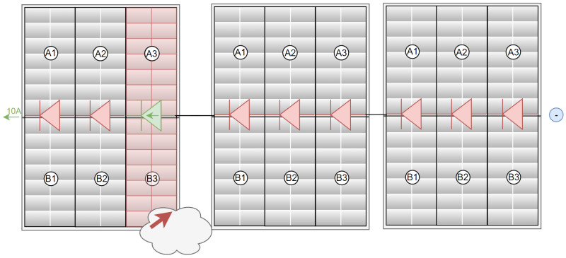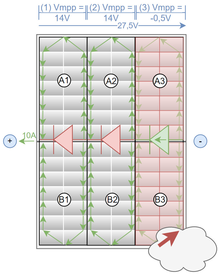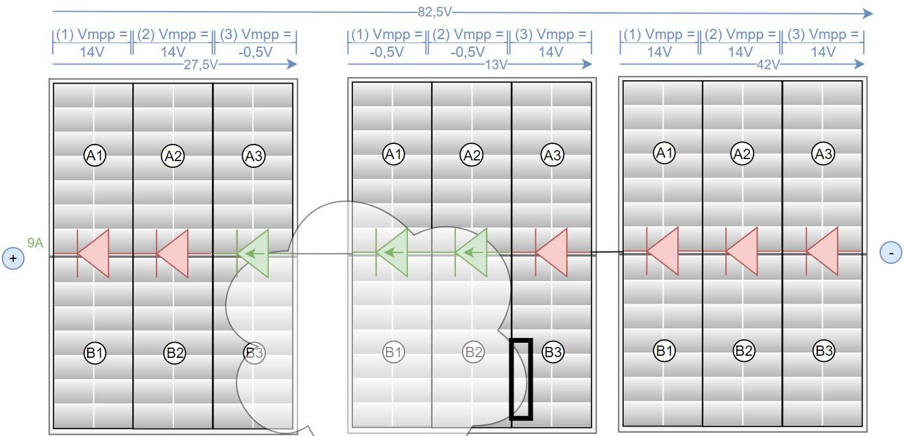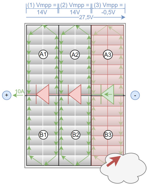 Um besser mit einer Teilverschattung umgehen zu können besitzen heutige PV-Panels 3 Bypass-Dioden, welche Teile des Moduls deaktivieren können. Durch das Anpassen der String-Spannung schalten die Dioden durch und umgehen den verschatteten Teilbereich.