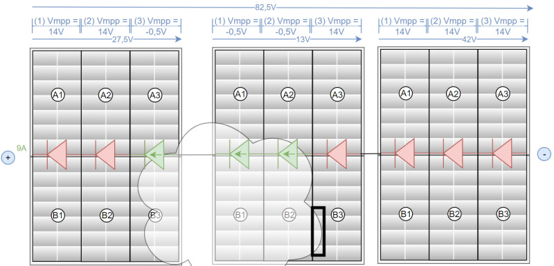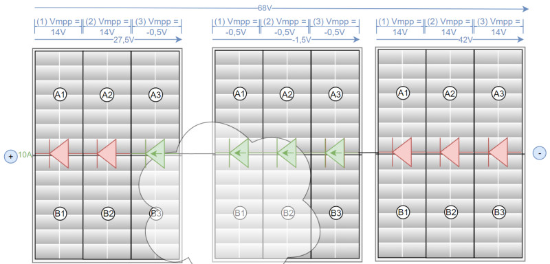 In dem ersten Beispiel verwendet der Wechselrichter die Spannung für 3 unverschattete Module: Vmpp, keine der Bypass-Dioden wird aktiv:
