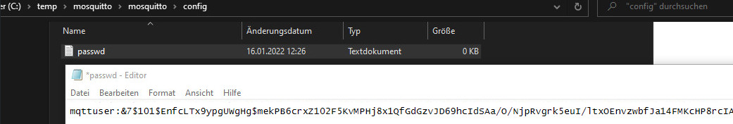 Der Inhalt der Ausgabe mqttuser:???, kann dann im Ordner /config in die Datei passwd gegeben werden: