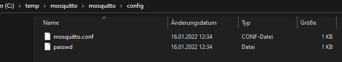 Dann sollte noch eine neue Datei "mosquitto.conf" für dir Konfiguration mit folgendem Inhalt angelegt werden: