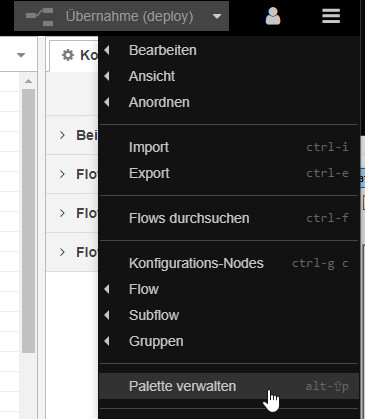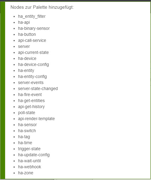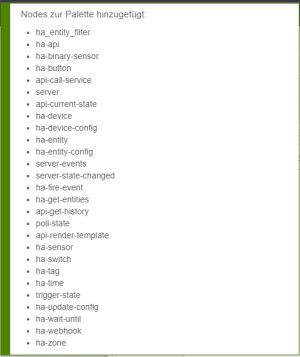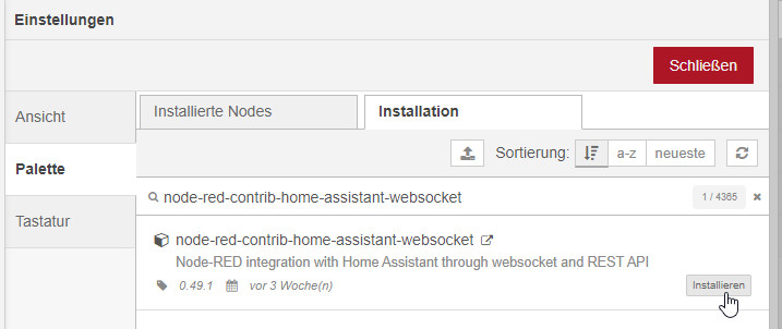 Zurück in Node-Red, benötigen wir für den Zugriff noch eine "Palette": node-red-contrib-home-assistant-websocket