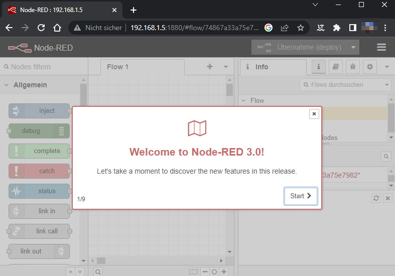 Der Aufruf der Weboberfläche kann dann über die IP-Adresse des Docker-Hosts und dem Port 1880 erfolgen: