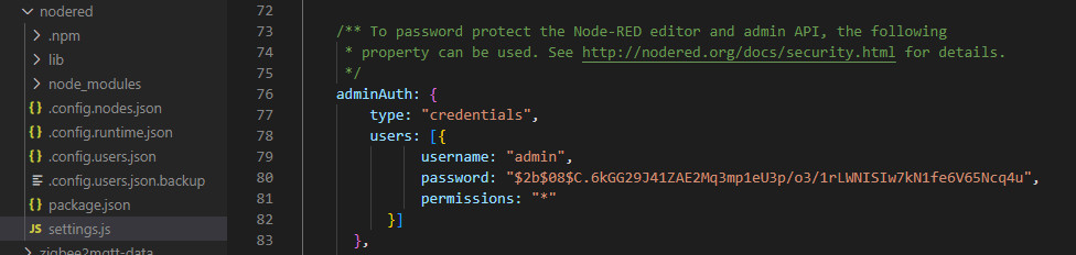 Nach dem ersten Start wird der in docker-compose.yml verwendete Unterordner ./nodered automatisch befüllt. Für das Setzen eines neuen Admin-Passworts, kann über folgenden Befehl ein Passwort-Hash generiert werden. Eingetragen in der settings.js-Datei, wird das Passwort geändert:
