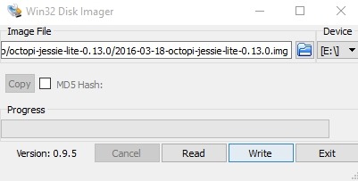 Das Aufspielen des Images erfolgt wieder mittels Win32 Disk Imager: