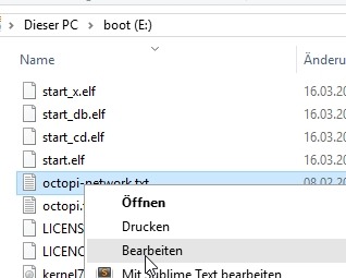 Die Netzwerkeinstellungen können direkt auf der SD-Karte, in der Datei octopi-network.txt eingestellt werden: