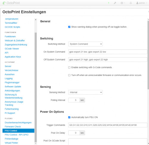 über das Plugin PSU-Control kann mithilfe eines Relais die Stromzufuhr zum Drucker unterbrochen werden.
