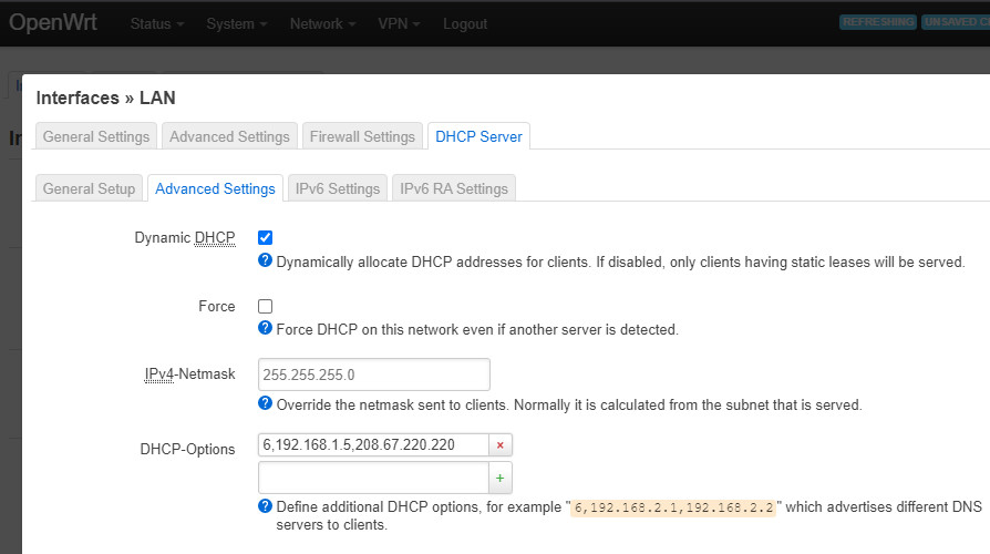 Damit der DHCP-Server einen anderen DNS-Server für die Clients verwendet, können alternative DNS-Server in den DHCP-Options mitgegeben werden: