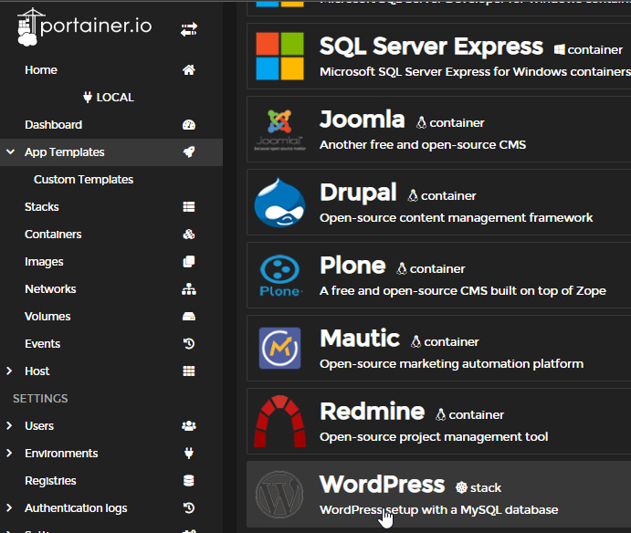 Neue Container können in Portainer über vorbereitete App Templates erstellt werden, z.B: WordPress, Joomla oder Drupal:
