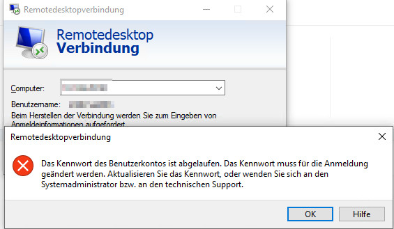 Sollte die Anmeldung nicht mehr möglich sein, weil das Kennwort abgelaufen ist, kann eventuell das Erstellen und Umschreiben eines RDP-Files helfen:
