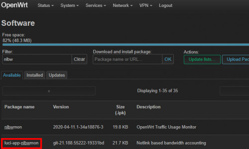 Der Netlink Bandwidth Monitor zeigt die Datenverteilung einzelner GerĂ€te pro Monat. Die Installation erfolgt einfach ĂŒber die Paketverwaltung durch die Installation des Paketes: luci-app-nlbwmon