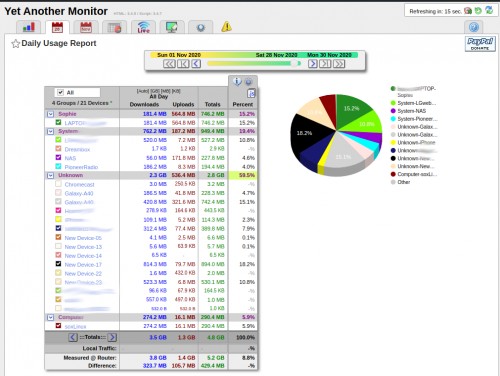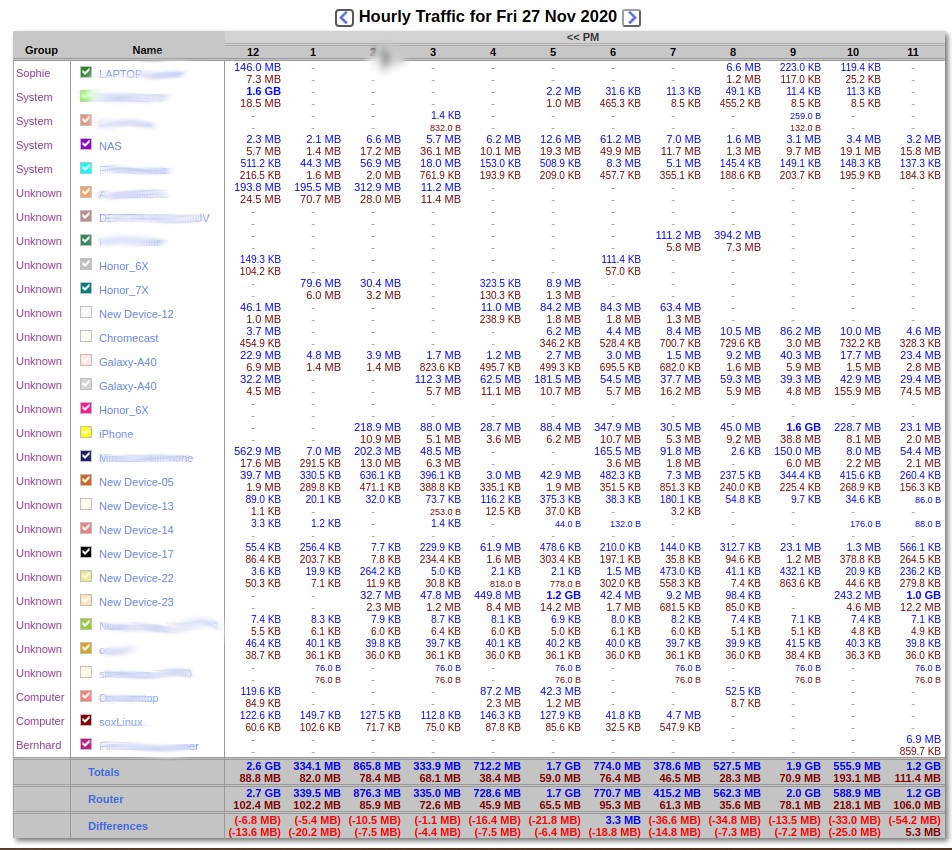 Die meisten Router zeigen einen Ăberblick ĂŒber alle verbundenen GerĂ€te, manche eine Momentaufnahme der verwendeten Bandbreite, kaum einer gibt aber einen Ăberblick ĂŒber die verbrauchte Datenmenge eines bestimmten Zeitraumes und schon gar nicht von welchem GerĂ€t diese verbraucht wurde. Um die konsumierte Bandbreite etwas transparenter zu gestalten, war ich auf der Suche nach einer Möglichkeit die Bandbreite pro GerĂ€t historisch aufzuzeichnen. Die Firmware von normalen Routern bieten hier kaum eine Möglichkeit, anders beim Einsatz einer Open-Source-Firmware, zum Beispiel OpenWRT, siehe: Alternative Router Firmware: OpenWrt und nicht mehr DD-WRT.