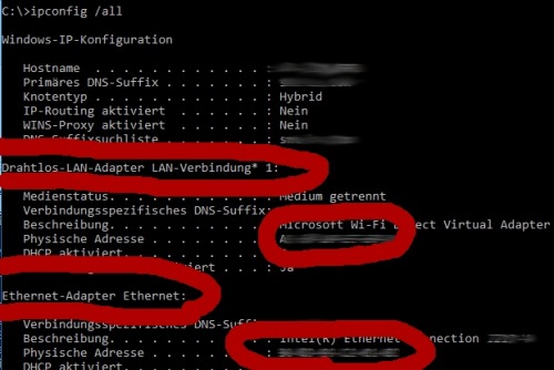 Die MAC-Adresse kann entweder mit dem Befehl getmac oder mit ipconfig /all ausgelesen werden: