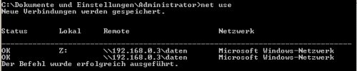 Mittels des Befehls netuse können verbundene Netzlaufwerke angezeigt werden