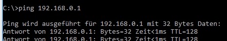 Die Antwort heißt in diesem Fall: das Gerät mit 192.168.0.1 ist erreichbar und befindet sich in unmittelbarer Nähe, da Zeit<1ms
