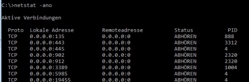 Der Befehl: netstat -ano gibt eine Liste aller Netzwerkverbindungen aus.