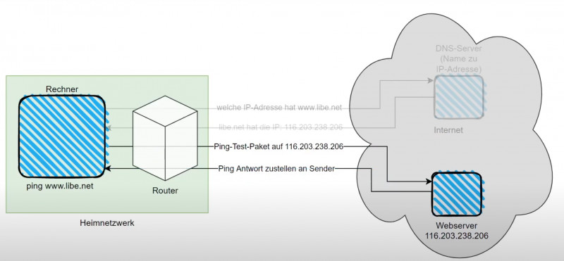 Ping, fordert von dem Netzwerkgerät eine Antwort und misst die Zeit bis diese zurückkommt (RTT: Round trip; Latenz)