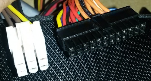 Hier das Bild eines etwas kleineren 24-poligen ATX-Steckers, inkl. 6poligen EPS-Stecker, die vorgestellte Belegung für den Betrieb des Netzteils passt hier nicht: