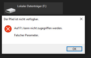 Der Pfad ist nicht verfügbar. Auf D:\ / E:\ / F:\ kann nicht zugegriffen werden. Falscher Parameter.