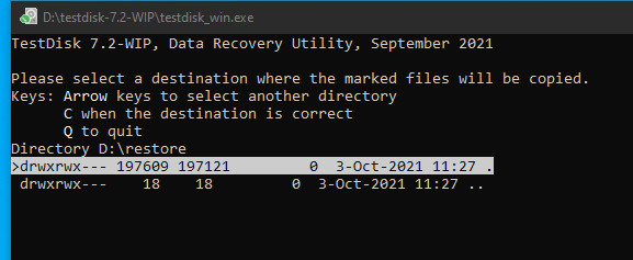 An dieser Stelle können nur Ordner von dem Laufwerk auf dem sich der Testdisk-Ordner befindet ausgewählt werden, es ist nicht möglich das Laufwerk auszuwählen. Um ein alternatives Laufwerk für den Kopiervorgang zu verwenden, muss Testdisk als Workaround auf einen anderen Datenträger kopiert und von diesem gestartet werden.