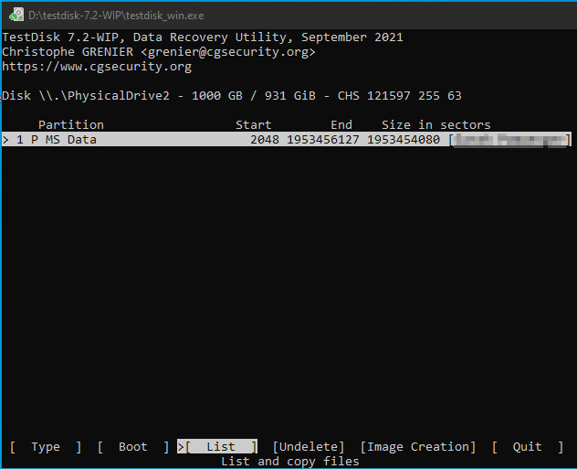 In diesem Menü ist es auch möglich bereits gelöschte Dateien über „Undelete“ wiederherzustellen oder den Boot-Sector neu zu schreiben, wir wählen aber „List“ um alle Dateien der Partition aufzulisten: